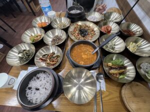 12種類の食べ放題のおかずに雑穀釜飯、アサリのピリ辛炒めと味噌チゲをオーダーしました。キムチやれんこん、ネギなどごはんと合うものが多かったですね。雑穀釜飯はおこげでないところを最初に取り出して、最後におこげの部分にお茶をかけて食べることを教えてもらい、温かいシメは最高でした。